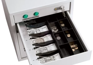 Верхний ящик снабжен пластиковым лотком на 5 (4)номиналов банкнот (с прижимами) и отделением для монет